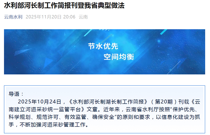 2025年10月24日,《水利部河长制湖长制工作简报》(第20期)专题刊载《云南建立河道采砂统一监管平台》一文,重点推介...